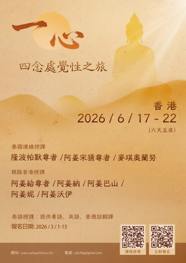 【正式报名即将开启】一心|四念处觉性之旅通知公告 / 作者: Ganluyu.net 一心|四念处觉性之旅【正式报名即将开启】诚邀参加2026年6月在香港举办的「四念处觉性之旅」!📌 正式报名开放时间2026年3月1日上午9时至3月15日下午11时59分🗓️ 课程日期2026年6月17日至22日📍 形式线下 (香港现场) 及线上 (Zoom)🎙️ 语言泰语授课,提供粤语、英语及普通话翻译🔗 详情及报名http://www.satipatthana.life